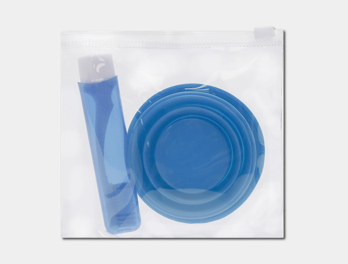 La brosse à dents en PP se replie pour réduire l’encombrement, tandis que le gobelet en silicone se plie facilement après utilisation. L’ensemble est présenté dans un sac transparent en PVC avec fermeture éclair, pratique pour le rangement et le transport.