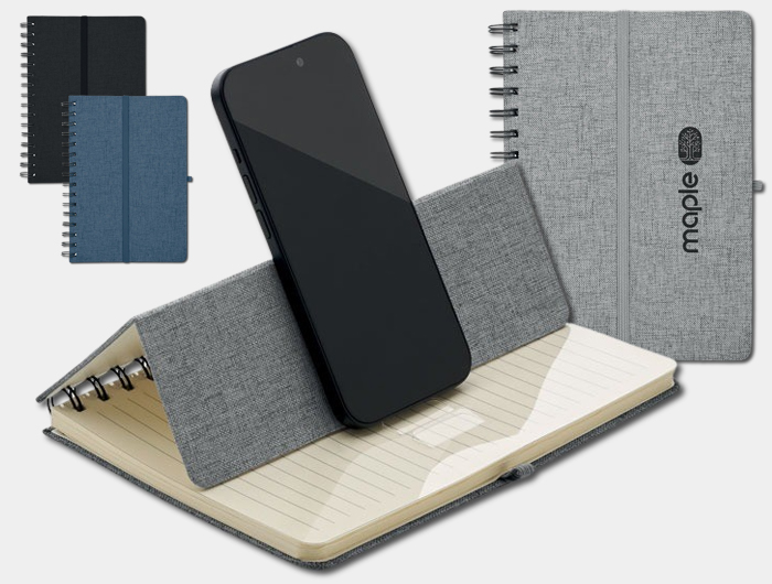Alliez praticité et communication responsable avec ce carnet publicitaire A5 à spirale conçu en tissu 600D RPET recyclé. Élégant et moderne, il intègre une fonction support pour smartphone permettant de maintenir l’écran en position horizontale, idéale pour les réunions, visios ou formations à distance.