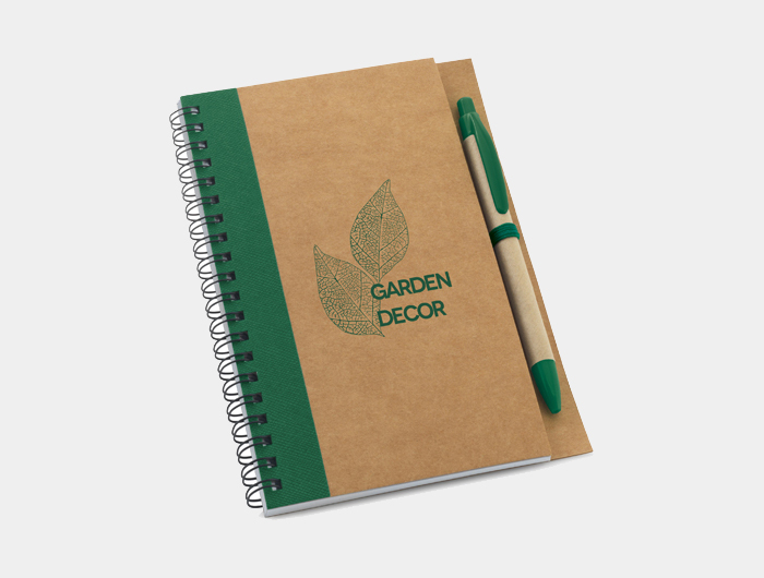 Carnet Publicitaire à spirale avec couverture rigide en carton recyclé avec un stylo de couleur assortie