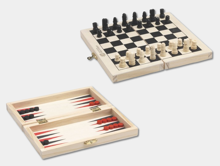 Contenu : pièces de jeu en bois (échecs, dames, backgammon) + dé