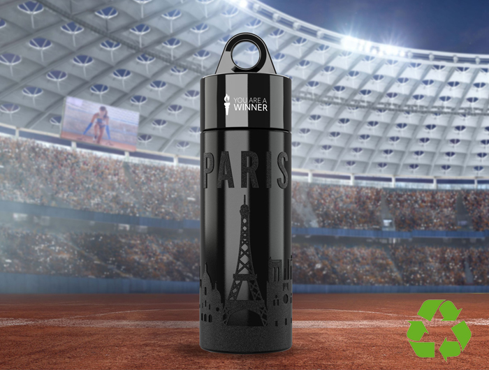 Gourde publicitaire de 500 ml ornée d'un visuel en 3D de la ligne d'horizon de la ville de Paris, mettant en valeur la majestueuse Tour Eiffel