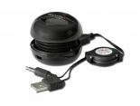 Haut-parleur en forme de tube avec micro amovible et fiche 3,5 mm rétractable. Finition mate et maillage gris sur le dessus.