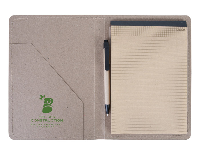 Conférencier fabriqué en papier cartonné recyclé, fermeture par bouton pression, muni d'un bloc notes de 20 feuilles et de divers poches de rangement.