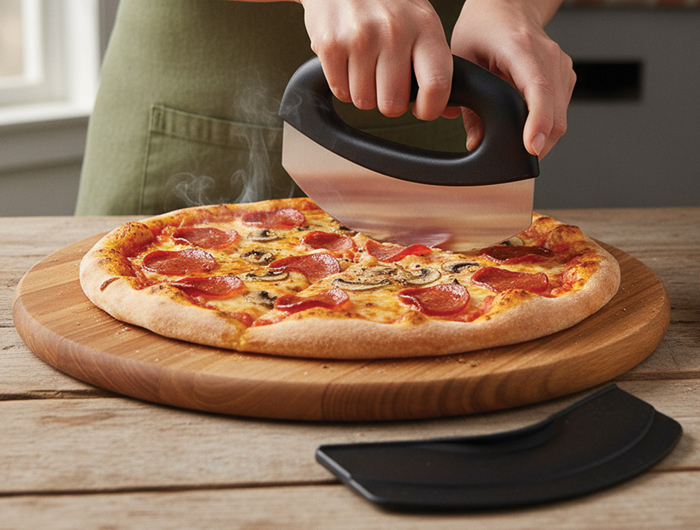 Coupe-pizza professionnel à lame basculante en acier inoxydable, idéal pour une découpe nette et rapide des pizzas. Son manche ergonomique en plastique assure une bonne prise en main, même en usage intensif.