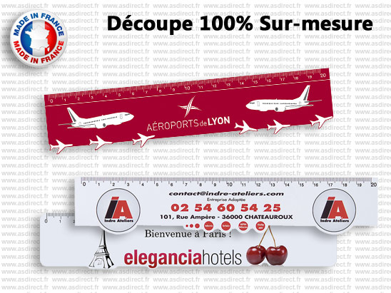 Règle Personnalisée avec découpe sur mesure, forme adaptée à votre communication dans cet exemple réalisée pour l'aéroport de la ville de Lyon.