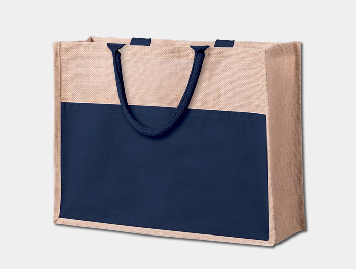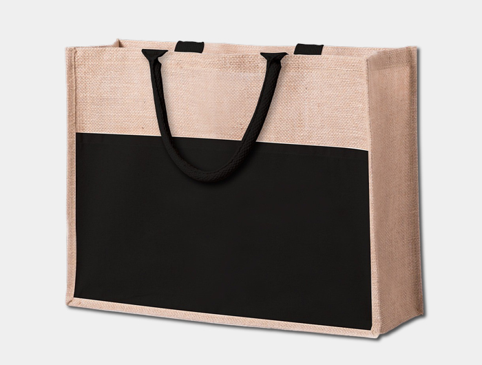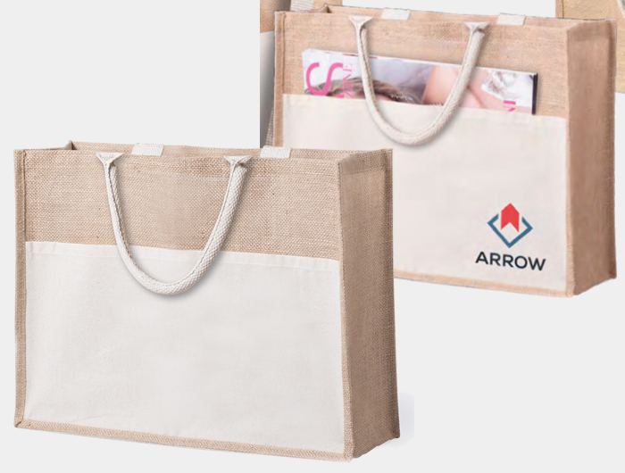 Sac jute personnalisé, avec poignées renforcées en coton, soufflets de côtés, poche avant en coton