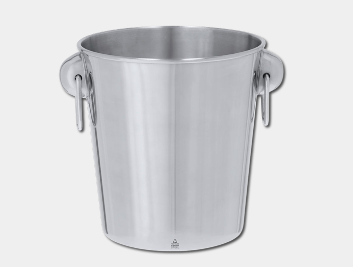 Seau à glace publicitaire en acier inoxydable recyclé d’une capacité de 4 litres, idéal pour rafraîchir bouteilles de vin, champagne ou autres boissons lors d’événements, réceptions ou opérations promotionnelles.