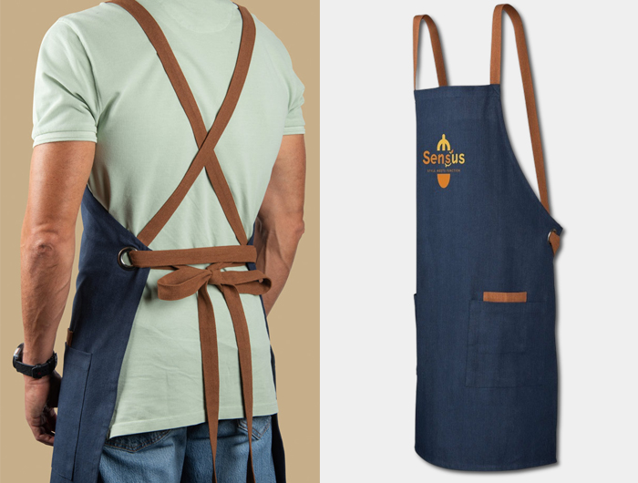 Les bretelles croisées dans le dos apportent une touche contemporaine tout en assurant un ajustement confortable et personnalisable, adapté aux métiers de bouche, commerces et événements.