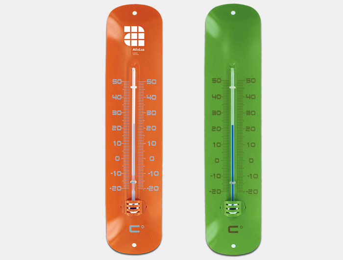 Coloris au choix : thermomètre laqué bleu, thermomètre laqué vert, thermomètre laqué rouge, thermomètre laqué orange