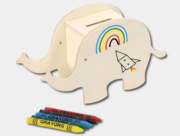 Tirelire en bois naturel en forme d’éléphant, livrée avec 5 crayons de couleur pour permettre à chacun de créer son propre décor. Un objet ludique et personnalisable, particulièrement adapté aux boutiques de zoo, parcs animaliers, musées, actions pédagogiques et campagnes de sensibilisation à la protection des espèces.
