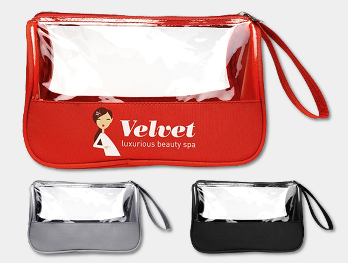 Trousse de toilette Imprimée, Trousse toilette en microfibres et sans phtalate, Trousse Publicitaire avec dragonne, partie plastique transparent